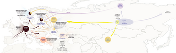 Around 3,000 BC, people of the Yamnaya culture or a closely related group,[2] who had high levels of WSH ancestry with some additional Neolithic farmer admixture,[5][10] embarked on a massive expansion throughout Eurasia, which is considered to be associated with the dispersal of at least some of the Indo-European languages by most contemporary linguists, archaeologists, and geneticists. WSH ancestry from this period is often referred to as Steppe Early and Middle Bronze Age (Steppe EMBA) ancestry.[ت]