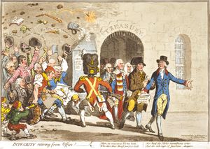في طريقة جديدة لسداد الدين الوطني (1786)، جيمس گيل‌راي ويسخر من الملكة شارلوت وجورج الثالث غارقين في سندات الخزانة لتغطية الديون الملكية، ويصوّر پت معطياً إياهم كيس أموال اضافي.