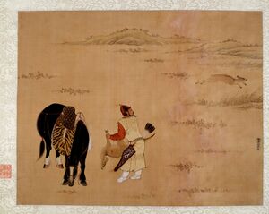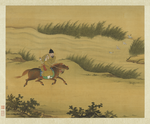 As a child, Zhu Zhanji was trained in both military skills and Confucian literature by Hanlin academics. He was a talented man of letters, but his physical prowess, in contrast to his father's frail health, made him excel in military disciplines. This impressed Yongle Emperor,[1] who shared Zhu Zhanji's love for hunting and riding.[4] Yongle allowed him to accompany him on hunting trips and military inspections. In 1414, the Yongle Emperor even took the young prince with him on a campaign against the Mongols.[3] Later, as emperor, Zhu Zhanji personally participated in skirmishes with the Mongols on the northern border. During one of these battles, he demonstrated his skill with a bow by shooting several Mongol warriors.[1]
